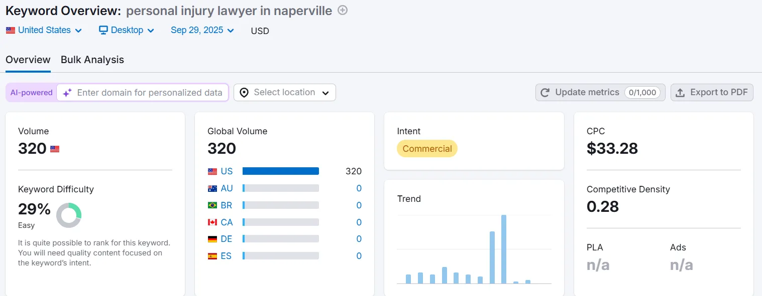 When I worked with a mid-sized injury firms in Los Angeles, the attorney initially wanted to compete head-on for “Los Angeles personal injury lawyer.” I advised him against it and instead built campaigns around suburbs like Naperville, Schaumburg, and Evanston. Within months, he began receiving calls and filled forms from those areas — not hundreds of calls, but enough steady leads to sustain his business and grow his reputation. A year later, he was finally strong enough to begin ranking for competitive Los Angeles terms. Feel free to contact me to ask, so I can share real results of that specific client!