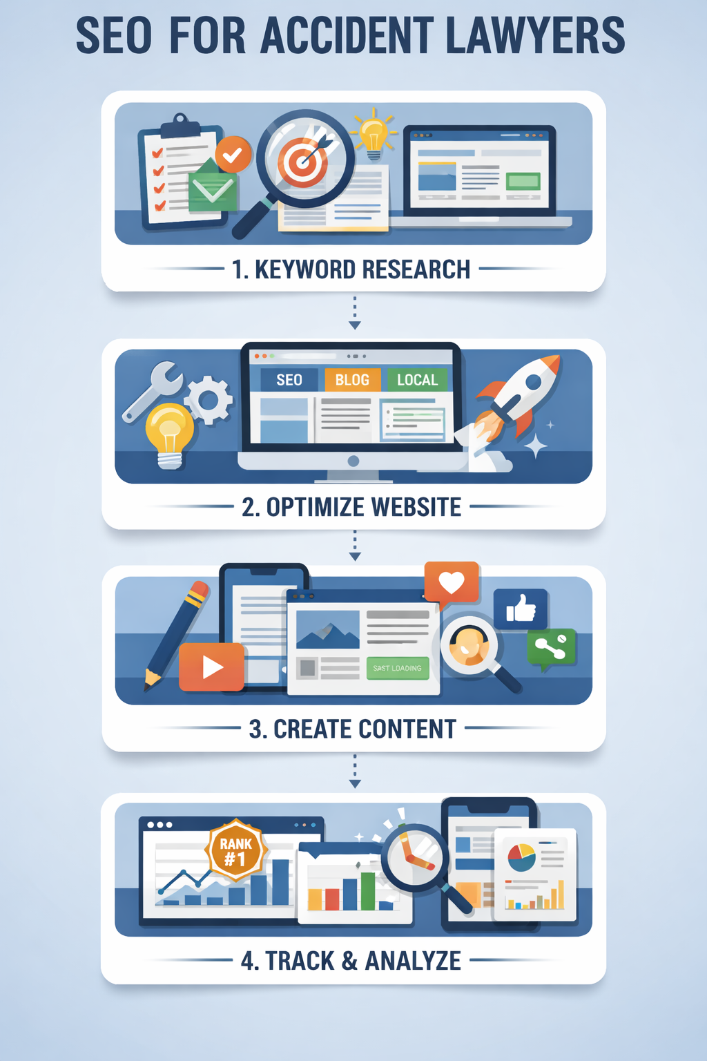 We achieve this by optimizing your Google business profile, creating location-specific service pages for your site, and targeting neighborhood-level keywords that speak to city, country, or region visibility. The content we create for your firm, from blogs and guides to resources and articles, will answer real client questions in a trustworthy way. These content highlights will be designed to help those who have been involved in accidents take the next steps in your firm’s direction for assistance.