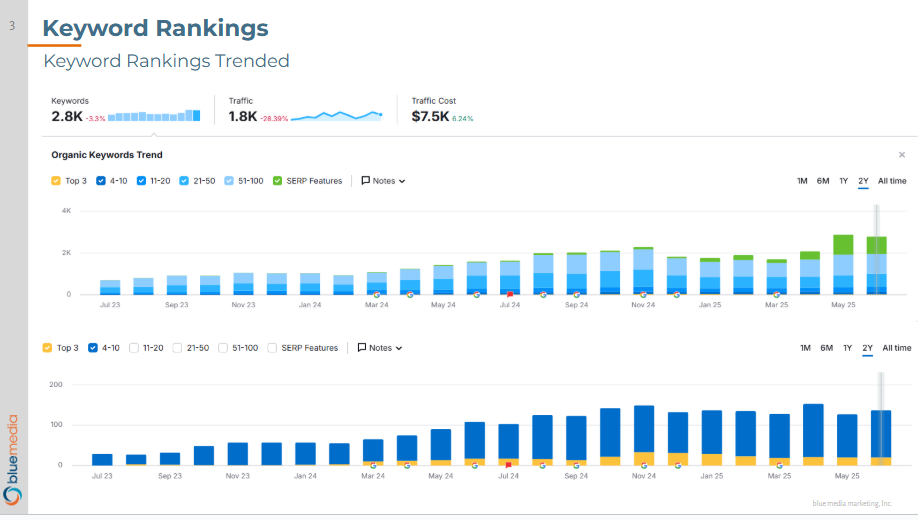 “Blue Media Marketing law took our SEO to a 41% increase in traffic and 391% increase in top 3 keywords on Google! I recommend their services to anyone looking for optimal growth.”